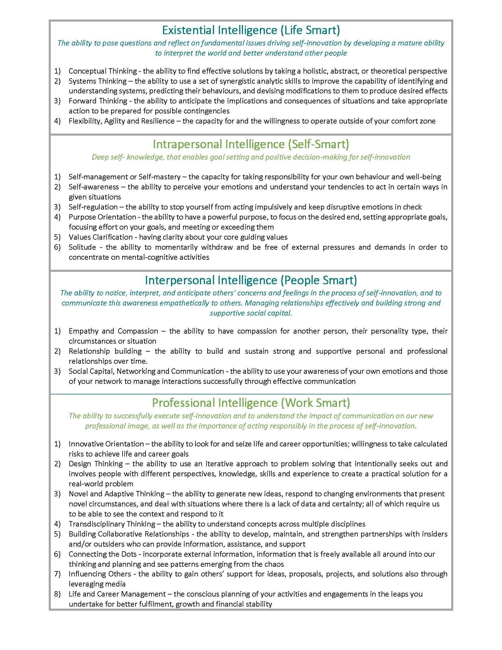 At the LEAP Academy we have identified four key meta-competencies that LEAP Thinkers need to possess. The first meta-competency relates to existential intelligence or being life smart. Existential intelligence is about the ability to pose questions and reflect on fundamental issues in ways that develop a mature ability to interpret the world and better understand other people. You also have to change your awareness of yourself, so that you internalise and value that change. Thus, the second meta-competency is intrapersonal intelligence or being self-smart. Intrapersonal intelligence is defined as having deep self-knowledge and being able to set clear life goals and make effective value-aligned decisions. Thirdly, you must develop the capacity to relate. Here, the meta-competency of interpersonal intelligence or being people smart, relates to the ability to notice, interpret, and anticipate others’ concerns and feelings, and to communicate this awareness empathetically to others. It also includes managing relationships effectively and building strong and supportive social capital. Just as well-known business guru, Tom Peters, encourages all organisations who want to be successful to learn and to innovate on a continuous basis, the final key meta-competency implies that individuals should do the same. To be professionally intelligent or work smart means to have the ability to successfully execute self-innovation and to understand the impact of communication on your new professional image, as well as the importance of acting responsibly during the process of self-innovation. In developing your existential, intrapersonal, interpersonal and professional intelligence, you learn how to learn, adapt, anticipate and create to effectively become a LEAP Thinker.