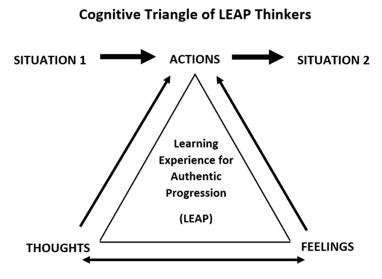 As explained in a previous blog post, we use the word ‘LEAP’ as an acronym for “Learning Experience for Authentic Progression”. Thus, not only implying that, by reading the word ‘leap’, our clients symbolically jump from one situation to another, but also revealing the method of how they will achieve this. And here lies the difference: On The LEAP Journey, you change your situation by learning and transforming from the inside-out and not from the outside-in. LEAP Thinkers set out to first know and understand their real selves, before they reinvent their personal brands accordingly, and leap. Most other transformational programs focus on changing one’s external behaviour for leaping; thus only focusing on changing your perception self so that others can see you differently. This explains why the results are short-term, and soon after the intervention ends, the person reverts to his or her former behaviour. On The LEAP Journey, you learn that you can only leap meaningfully if you align your life and career with who you truly are. In essence, The LEAP Journey requires deep self-work and is a learning experience that changes the way you think (your mindset). It also changes the way you feel (your state of mind). These changes in your thoughts and feelings will enable you to leap (act) beyond mindfulness from your current situation to a future situation of meaning and purpose. Our Cognitive Triangle of LEAP Thinkers below, best illustrates this point: